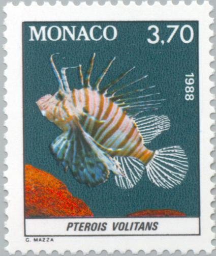 Visibility: public Image owner: none postage 1/15/1988 3.70fr multi issue=Fish in Oceanographic Museum Aquarium dt=fish in Oceanographic Museum Aquarium (1988) d=Pterois volitans (1988) unwmk perf=13x12.75 Crops No visible images cropped from this one. Measurements Resolution is unknown. Source Source name: Colnect File URL: http://i.colnect.net/images/b/149/260/Red-Lionfish-Pterois-volitans.jpg Uploaded September 3, 2014, 9:54 pm by Stan Shebs |