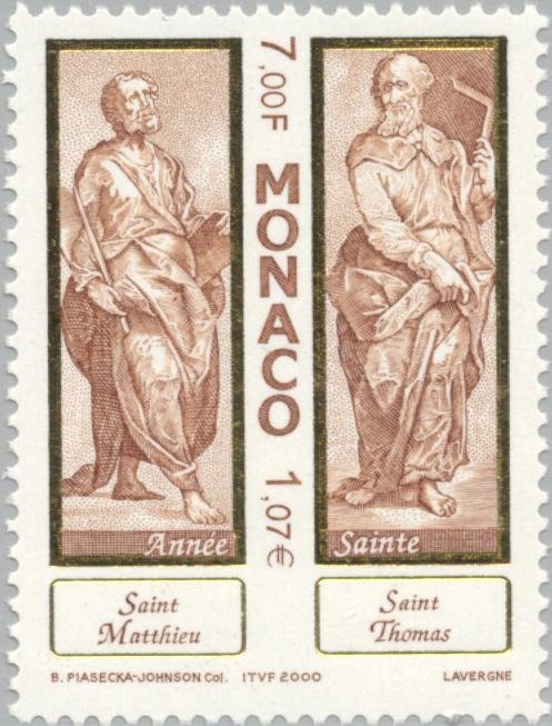 Visibility: public Image owner: none postage 4/3/2000 7.00fr|1.07€ gld&brn issue=Twelve Apostles d=St. Matthew and St. Thomas unwmk perf=13.25 Crops No visible images cropped from this one. Measurements Resolution is unknown. Source Source name: Colnect File URL: http://i.colnect.net/b/150/058/Saint-Matthew-and-Saint-Thomas.jpg Uploaded September 3, 2014, 10:25 pm by Stan Shebs |
