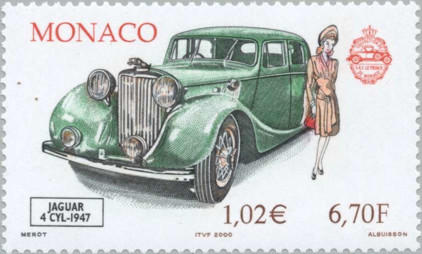 Visibility: public Image owner: none postage 6/23/2000 6.70fr|1.02€ multi issue=Motor Cars and Fashion - Motor Cars from the Royal Collection d=Jaguar 4 Cyl 1947 unwmk perf=13x13.25 Crops No visible images cropped from this one. Measurements Resolution is unknown. Source Source name: Colnect File URL: http://i.colnect.net/b/150/087/Jaguar-4-Cyl-1947.jpg Uploaded September 3, 2014, 10:25 pm by Stan Shebs |