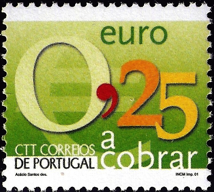 Visibility: public Image owner: none postage 1/2/2002 0.25€ multi issue=Taxa a cobrar unwmk Crops No visible images cropped from this one. Measurements Resolution is unknown. Source Source name: Colnect File URL: http://i.colnect.net/images/b/1399/138/Euro-Symbol.jpg Uploaded September 4, 2014, 3:45 pm by Stan Shebs |