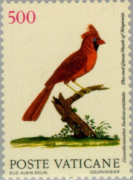 Visibility: public Image owner: none postage 6/13/1989 500l multi dt=bird engravings by Albin d=Northern Cardinal Cardinalis cardinalis unwmk Crops No visible images cropped from this one. Measurements Resolution is unknown. Source Source name: Colnect File URL: http://i.colnect.net/b/151/502/Northern-Cardinal-Cardinalis-cardinalis.jpg Uploaded September 4, 2014, 8:46 pm by Stan Shebs |