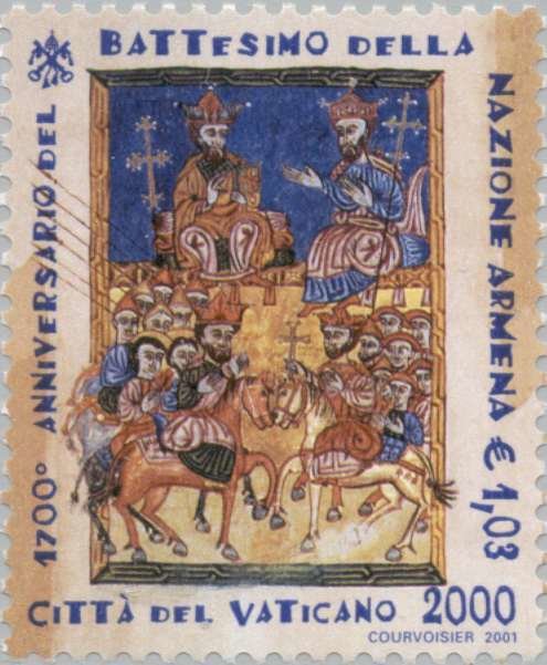 Visibility: public Image owner: none postage 2/15/2001 2000(l)|1,03€ multi issue=1700th Anniversary of Christian Conversion of Armenia unwmk perf=11.75 Crops No visible images cropped from this one. Measurements Resolution is unknown. Source Source name: Colnect File URL: http://i.colnect.net/b/151/982/King-Tiridates-and-Constantine.jpg Uploaded June 10, 2013, 10:52 pm by Stan Shebs |