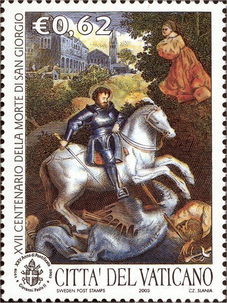 Visibility: public Image owner: none postage 5/6/2003 0.62€ multi issue=1700th Anniversary of the Birth of St. George d=St George killing the dragon unwmk perf=13x12.75 Crops No visible images cropped from this one. Measurements Resolution is unknown. Source Source name: Colnect File URL: http://i.colnect.net/b/804/248/St-George-killing-the-dragon.jpg Uploaded September 4, 2014, 8:59 pm by Stan Shebs |