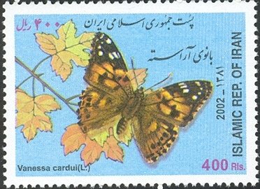 Visibility: public Image owner: none postage 7/29/2002 400r multi dt=butterflies (2002 Iran) unwmk Crops No visible images cropped from this one. Measurements Resolution is unknown. Source Source name: Colnect File URL: http://i.colnect.net/images/b/1103/275/Painted-Lady-Vanessa-cardui.jpg Uploaded September 4, 2014, 10:34 pm by Stan Shebs |