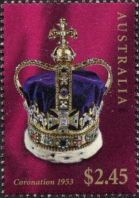 Visibility: public Image owner: none postage 6/2/2003 $2.45 multi issue=Queen Elizabeth II coronation 50th d=St Edwards Crown (2003) unwmk Crops No visible images cropped from this one. Measurements Resolution is unknown. Source Source name: Colnect File URL: http://i.colnect.net/b/457/351/St-Edwards-Crown.jpg Uploaded August 12, 2014, 9:29 pm by Stan Shebs |