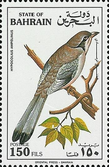Visibility: public Image owner: none postage 3/21/1992 150f multi dt=migratory birds of Bahrain d=Grey Hypocolius - Hypocolius ampelinus unwmk perf=14.75 Crops No visible images cropped from this one. Measurements Resolution is unknown. Source Source name: Colnect File URL: http://i.colnect.net/images/b/854/615/Grey-Hypocolius-Hypocolius-ampelinus.jpg Uploaded September 5, 2014, 5:44 pm by Stan Shebs |
