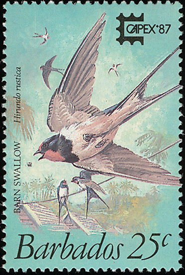 Visibility: public Image owner: none postage 6/12/1987 25c multi issue=Capex '87 dt=birds (1987 Barbados) d=Hirundo rustica (1987) wmk=crown & script CA spiral perf=14 Crops No visible images cropped from this one. Measurements Resolution is unknown. Source Source name: Colnect File URL: http://i.colnect.net/images/b/863/980/Barn-Swallow-Hirundo-rustica.jpg Uploaded September 5, 2014, 5:49 pm by Stan Shebs |
