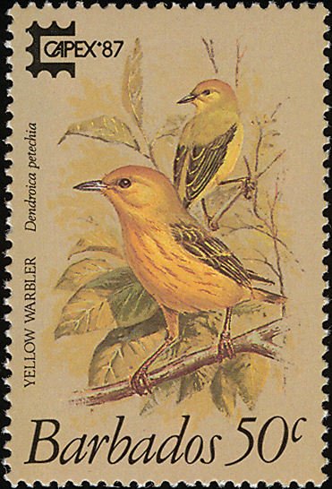 Visibility: public Image owner: none postage 6/12/1987 50c multi issue=Capex '87 dt=birds (1987 Barbados) d=Dendroica petechia (1987) wmk=crown & script CA spiral perf=14 Crops No visible images cropped from this one. Measurements Resolution is unknown. Source Source name: Colnect File URL: http://i.colnect.net/images/b/863/981/American-Yellow-Warbler-Dendroica-petechia.jpg Uploaded September 5, 2014, 5:49 pm by Stan Shebs |