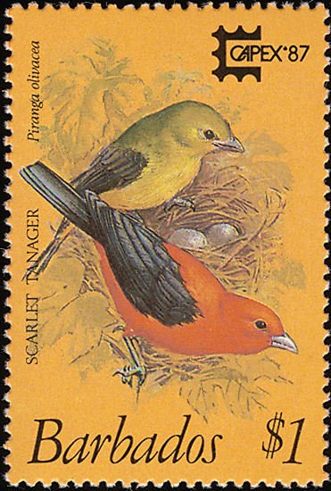 Visibility: public Image owner: none postage 6/12/1987 $1 multi issue=Capex '87 dt=birds (1987 Barbados) d=scarlet tanager Piranga olivacea wmk=crown & script CA spiral perf=14 Crops No visible images cropped from this one. Measurements Resolution is unknown. Source Source name: Colnect File URL: http://i.colnect.net/images/b/863/984/Scarlet-Tanager-Piranga-olivacea.jpg Uploaded September 5, 2014, 5:49 pm by Stan Shebs |