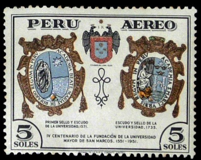 Visibility: public Image owner: none airmail 12/10/1951 5s multi issue=San Marcos University 400th d=arms of San Marcos University unwmk Crops No visible images cropped from this one. Measurements Resolution is unknown. Source Source name: Colnect File URL: http://i.colnect.net/b/1594/754/Coats-of-Arms-of-1571-and-1735.jpg Uploaded September 5, 2014, 6:42 pm by Stan Shebs |