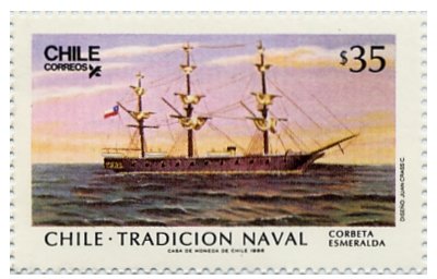 Visibility: public Image owner: none postage 5/30/1986 35p multi dt=historic ships of the Chilean Navy unwmk perf=13.25 Crops No visible images cropped from this one. Measurements Resolution is unknown. Source Source name: Colnect File URL: http://i.colnect.net/b/666/419/Corbeta-Esmeralda-1856.jpg Uploaded September 5, 2014, 8:57 pm by Stan Shebs |