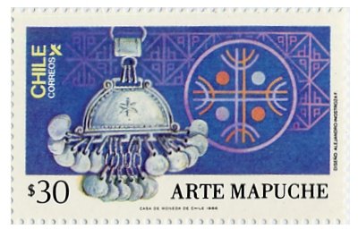 Visibility: public Image owner: none postage 10/17/1986 30p multi dt=pottery d=Mapuche ornament unwmk perf=13.25 Crops No visible images cropped from this one. Measurements Resolution is unknown. Source Source name: Colnect File URL: http://i.colnect.net/b/666/432/Mapuche-Art.jpg Uploaded September 5, 2014, 8:57 pm by Stan Shebs |