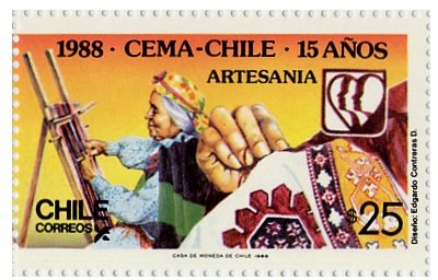 Visibility: public Image owner: none postage 10/25/1988 25p multi issue=15th Anniversary of Centre for Education of Women - Traditional Crafts unwmk perf=13.25 Crops No visible images cropped from this one. Measurements Resolution is unknown. Source Source name: Colnect File URL: http://i.colnect.net/b/661/846/Cema-Chile-15-Years-of-Craftsmanship.jpg Uploaded September 5, 2014, 9:07 pm by Stan Shebs |
