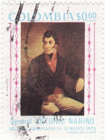 Visibility: public Image owner: none postage 12/13/1973 60c multi issue=150th Anniversary of the Death of General Antonio Narino d=JMEspinoza General Antonio Nariño unwmk perf=13.75x14 Crops No visible images cropped from this one. Measurements Resolution is unknown. Source Source name: Colnect File URL: http://i.colnect.net/b/1096/278/JMEspinoza-General-Antonio-Nari-ntilde-o.jpg Uploaded September 6, 2014, 3:10 pm by Stan Shebs |