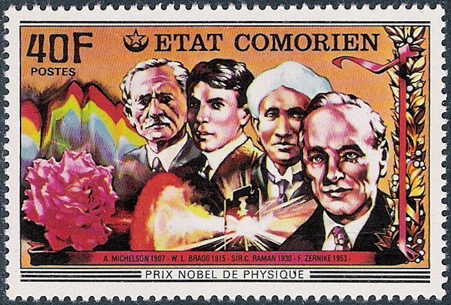 Visibility: public Image owner: none postage 7/7/1977 40fr multi issue=Nobel Prize Winners d=Michelson, Bragg, Raman and Zernike unwmk perf=13.5 Crops No visible images cropped from this one. Measurements Resolution is unknown. Source Source name: Colnect File URL: http://i.colnect.net/b/1470/483/Physicians-Michelson-Bragg-Raman-Zernike.jpg Uploaded September 6, 2014, 3:16 pm by Stan Shebs |