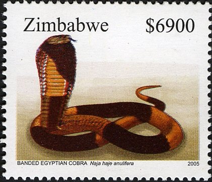 Visibility: public Image owner: none postage 7/12/2005 $6900 multi dt=snakes (2005 Zimbabwe) d=Banded Egyptian Cobra unwmk Crops No visible images cropped from this one. Measurements Resolution is unknown. Source Source name: Colnect File URL: http://i.colnect.net/b/554/127/Banded-Cobra-Naja-haje-ssp-annulifera.jpg Uploaded September 6, 2014, 4:12 pm by Stan Shebs |
