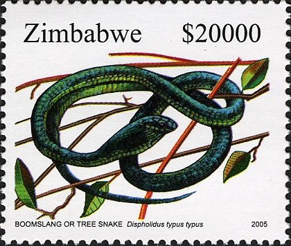 Visibility: public Image owner: none postage 7/12/2005 $20000 multi dt=snakes (2005 Zimbabwe) d=boomslang or Tree Snake unwmk Crops No visible images cropped from this one. Measurements Resolution is unknown. Source Source name: Colnect File URL: http://i.colnect.net/b/554/129/Boomslang-Dispholidus-typus-typus-.jpg Uploaded September 6, 2014, 4:12 pm by Stan Shebs |