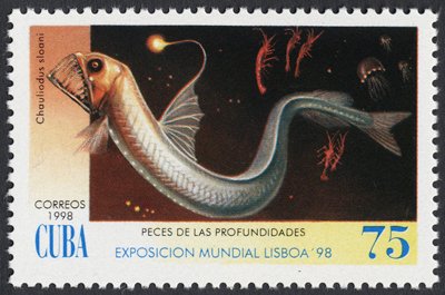 Visibility: public Image owner: none postage 5/22/1998 75c multi dt=deep sea fishes (1998) d=Chauliodus sloani unwmk perf=12.5x12.25 Crops No visible images cropped from this one. Measurements Resolution is unknown. Source Source name: Colnect File URL: http://i.colnect.net/images/b/852/919/Sloane--s-Viperfish-Chauliodus-sloani.jpg Uploaded September 6, 2014, 5:57 pm by Stan Shebs |
