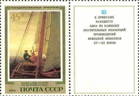 Visibility: public Image owner: none postage 11/10/1983 45k multi dt=German Paintings in Hermitage Museum d=On Board a Sailing Vessel by Caspar David Friedrich unwmk Crops No visible images cropped from this one. Measurements Resolution is unknown. Source Source name: Colnect File URL: http://i.colnect.net/b/659/338/On-Board-a-Sailing-Vessel-Caspar-David-Friedrich.jpg Uploaded September 6, 2014, 7:04 pm by Stan Shebs |