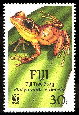 Visibility: public Image owner: none postage 10/3/1988 30c multi dt=Fiji Tree Frog d=Fiji Tree Frog Platymantis vitiensis wmk=crown & script CA spiral Crops No visible images cropped from this one. Measurements Resolution is unknown. Source Source name: Colnect File URL: http://i.colnect.net/b/1595/854/Fiji-Tree-Frog-Platymantis-vitiensis.jpg Uploaded September 6, 2014, 7:14 pm by Stan Shebs |