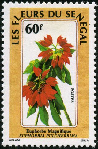 Visibility: public Image owner: none postage 12/4/1988 60fr multi dt=flowers (1988 Senegal) d=Euphorbia pulcherrima (1988 Senegal) unwmk perf=13x12.5 Crops No visible images cropped from this one. Measurements Resolution is unknown. Source Source name: Colnect File URL: http://i.colnect.net/images/b/897/918/Euphorbia-pulcherrima.jpg Uploaded September 6, 2014, 7:24 pm by Stan Shebs |