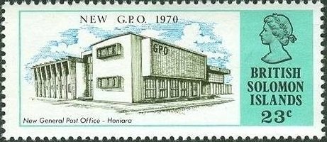 Visibility: public Image owner: none postage 4/15/1970 23c issue=Honiara GPO opening wmk=mult crown & script CA perf=13.25 Crops No visible images cropped from this one. Measurements Resolution is unknown. Source Source name: Colnect File URL: http://i.colnect.net/images/b/1590/274/New-Post-Office-Building.jpg Uploaded September 6, 2014, 7:29 pm by Stan Shebs |