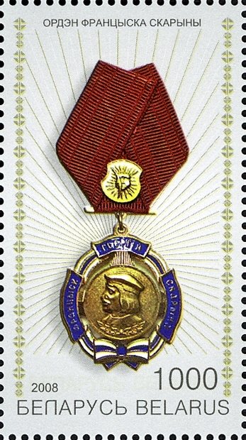 Visibility: public Image owner: none postage 8/28/2008 1000r multi dt=State Awards of the Republic of Belarus d=Order of Francysk Skaryna unwmk Crops No visible images cropped from this one. Measurements Resolution is unknown. Source Source name: Colnect File URL: http://i.colnect.net/images/b/1062/213/Order-of-Francysk-Skaryna.jpg Uploaded September 8, 2014, 2:49 pm by Stan Shebs |