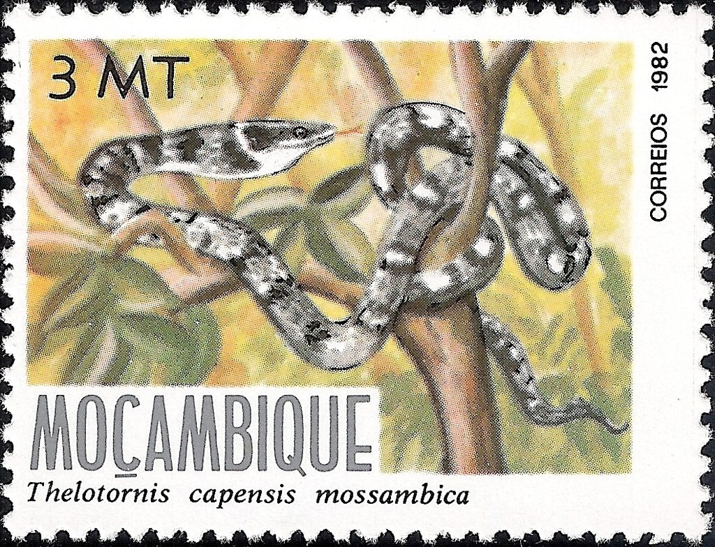 Visibility: public Image owner: none postage 2/27/1982 3mt multi dt=reptiles (1982 Mozambique) d=Thelotornis capensis mossambica unwmk perf=11 Crops No visible images cropped from this one. Measurements Resolution is unknown. Source Source name: Colnect File URL: http://i.colnect.net/images/b/1117/091/Twig-Snake-Thelotornis-capensis-mossambicanus.jpg Uploaded September 8, 2014, 4:45 pm by Stan Shebs |