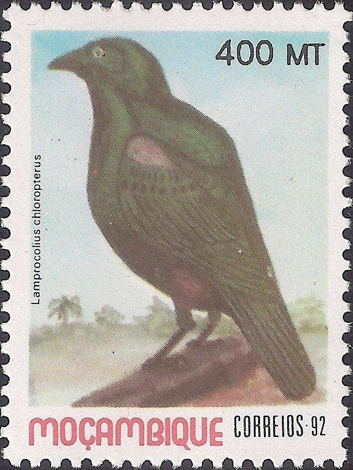 Visibility: public Image owner: none postage 7/24/1992 400mt multi dt=birds (1992 Mozambique) d=Lamprotornis chloropterus (1992) unwmk Crops No visible images cropped from this one. Measurements Resolution is unknown. Source Source name: Colnect File URL: http://i.colnect.net/images/b/1120/130/Lesser-Blue-eared-Starling-Lamprotornis-chloropterus.jpg Uploaded September 8, 2014, 5:05 pm by Stan Shebs |
