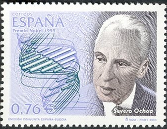 Visibility: public Image owner: none postage 3/20/2003 0.76€ multi issue=Nobel Laureates 2003 dt=Spanish Nobel laureates d=Double helix & Severo Ochoa unwmk Crops No visible images cropped from this one. Measurements Resolution is unknown. Source Source name: Colnect File URL: http://i.colnect.net/b/592/652/Spanish-Nobel-Laureates---Severo-Ochoa.jpg Uploaded July 17, 2013, 4:06 pm by Stan Shebs |