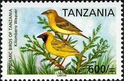 Visibility: public Image owner: none postage 3/25/2006 600sh multi issue=Endemic Birds of Tanzania dt=Endemic birds of Tanzania d=Kilombero Weaver unwmk perf=13 Crops No visible images cropped from this one. Measurements Resolution is unknown. Source Source name: Colnect File URL: http://i.colnect.net/b/1690/909/Kilombero-Weaver-Ploceus-burnieri.jpg Uploaded September 9, 2014, 8:50 pm by Stan Shebs |