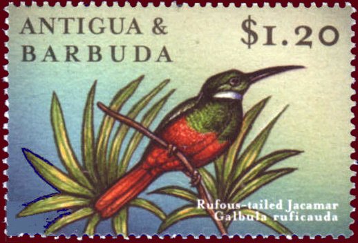 Visibility: public Image owner: none postage 4/17/2000 $1.20 multi issue=STAMP SHOW 2000 dt=birds of the Caribbean (2000) d=rufous-tailed jacamar Galbula ruficauda (2000) unwmk Crops No visible images cropped from this one. Measurements Resolution is unknown. Source Source name: Colnect File URL: http://i.colnect.net/b/1462/888/Rufous-tailed-Jacamar-Galbula-ruficauda.jpg Uploaded September 10, 2014, 2:05 pm by Stan Shebs |