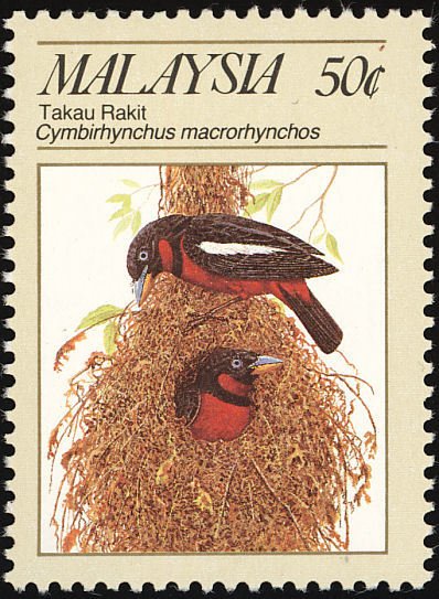 Visibility: public Image owner: none postage 6/30/1988 50c multi dt=Protected Birds of Malaysia d=Cymbirhynchus macrorhynchos (1988) wmk=SPM multiple perf=12.75x13.25 Crops No visible images cropped from this one. Measurements Resolution is unknown. Source Source name: Colnect File URL: http://i.colnect.net/images/b/1487/228/Black-and-red-Broadbill-Cymbirhynchus-macrorhynchos.jpg Uploaded September 10, 2014, 2:30 pm by Stan Shebs |