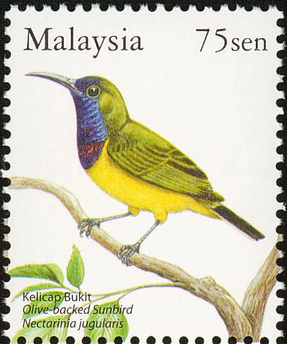 Visibility: public Image owner: none postage 5/14/2005 75sen multi dt=birds (2005 Malaysia) d=Nectarinia jugularis wmk=SPM multiple perf=13.75x14 Crops No visible images cropped from this one. Measurements Resolution is unknown. Source Source name: Colnect File URL: http://i.colnect.net/images/b/1505/037/Olive-backed-Sunbird-Cinnyris-jugularis.jpg Uploaded September 10, 2014, 2:35 pm by Stan Shebs |