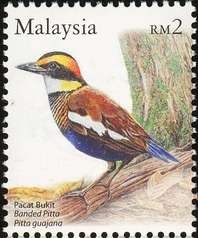 Visibility: public Image owner: none postage 5/14/2005 2rm multi dt=birds (2005 Malaysia) d=Pitta guajana (2005) wmk=SPM multiple perf=13.75x14 Crops No visible images cropped from this one. Measurements Resolution is unknown. Source Source name: Colnect File URL: http://i.colnect.net/images/b/1505/039/Malayan-Banded-Pitta-Hydrornis-irena.jpg Uploaded September 10, 2014, 2:35 pm by Stan Shebs |