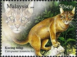 Visibility: public Image owner: none postage 3/13/2008 50sen multi dt=nocturnal animals (2008) d=Kucing tulap Catopuma temminckii wmk=SPM multiple Crops No visible images cropped from this one. Measurements Resolution is unknown. Source Source name: Colnect File URL: http://i.colnect.net/images/b/1437/421/Asian-Golden-Cat-Catopuma-temminckii-.jpg Uploaded September 10, 2014, 2:39 pm by Stan Shebs |