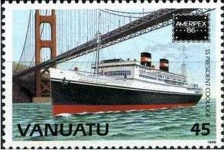 Visibility: public Image owner: none postage 5/19/1986 45v multi issue=Ameripex '86 d=SS President Coolidge as Luxus Liner before 1940 wmk=crown & script CA spiral perf=14 Crops No visible images cropped from this one. Measurements Resolution is unknown. Source Source name: Colnect File URL: http://i.colnect.net/images/b/1231/162/As-Luxus-Liner-before-1940.jpg Uploaded September 10, 2014, 2:52 pm by Stan Shebs |