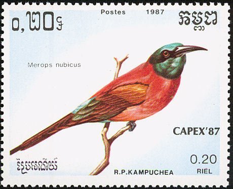 Visibility: public Image owner: none postage 5/5/1987 0.20r multi issue=Capex '87 dt=birds (1987 Cambodia) d=Merops nubicus (1987) unwmk Crops No visible images cropped from this one. Measurements Resolution is unknown. Source Source name: Colnect File URL: http://i.colnect.net/b/1523/494/Nubian-Bee-eater-Merops-nubicus.jpg Uploaded September 10, 2014, 6:58 pm by Stan Shebs |