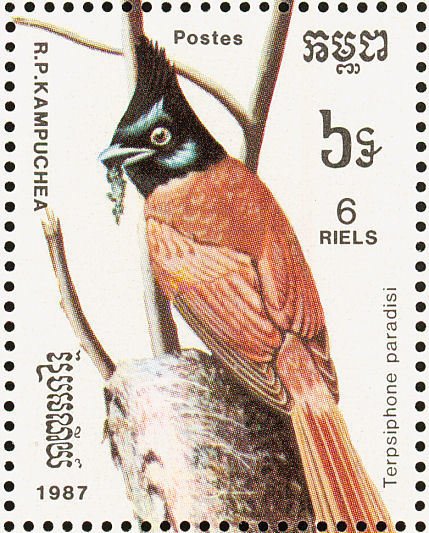 Visibility: public Image owner: none postage 5/5/1987 6r multi issue=Capex '87 dt=birds (1987 Cambodia) d=Terpsiphone paradisi (1987) unwmk Crops No visible images cropped from this one. Measurements Resolution is unknown. Source Source name: Colnect File URL: http://i.colnect.net/b/1526/972/Asian-Paradise-Flycatcher-Terpsiphone-paradisi.jpg Uploaded September 10, 2014, 6:58 pm by Stan Shebs |