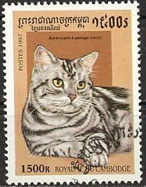Visibility: public Image owner: none postage 5/8/1997 1500r multi dt=cats (1997 Cambodia) d=American Short-hair unwmk Crops No visible images cropped from this one. Measurements Resolution is unknown. Source Source name: Colnect File URL: http://i.colnect.net/images/b/1118/534/American-Short-hair-Felis-silvestris-catus.jpg Uploaded September 10, 2014, 7:08 pm by Stan Shebs |