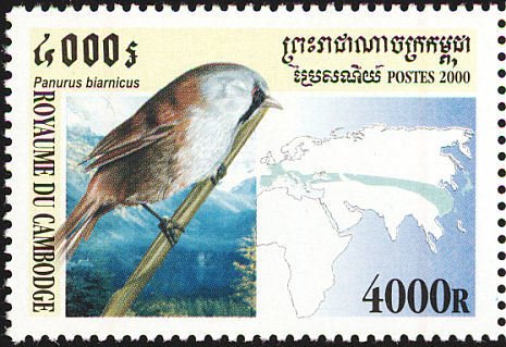 Visibility: public Image owner: none postage 12/10/2000 4000r multi dt=birds (2000 Cambodia) d=Panurus biarmicus unwmk Crops No visible images cropped from this one. Measurements Resolution is unknown. Source Source name: Colnect File URL: http://i.colnect.net/images/b/1527/039/Bearded-Reedling-Panurus-biarmicus.jpg Uploaded September 10, 2014, 7:28 pm by Stan Shebs |