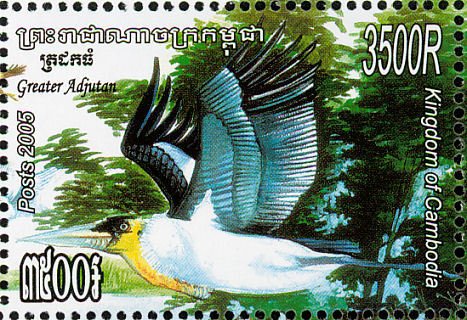 Visibility: public Image owner: none postage 12/5/2005 3500r multi issue=Water Birds 2005 dt=Water Birds (2005) d=Leptoptilos dubius (2005) unwmk Crops No visible images cropped from this one. Measurements Resolution is unknown. Source Source name: Colnect File URL: http://i.colnect.net/b/1527/049/Greater-Adjutant-Stork-Leptoptilos-dubius.jpg Uploaded September 10, 2014, 7:30 pm by Stan Shebs |