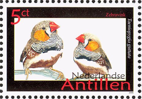 Visibility: public Image owner: none postage 8/18/2006 5c multi dt=birds (2006 Netherlands Antilles) d=Taeniopygia guttata unwmk perf=13.5x13 Crops No visible images cropped from this one. Measurements Resolution is unknown. Source Source name: Colnect File URL: http://i.colnect.net/b/966/969/Australian-Zebra-Finch Taeniopygia-guttatta.jpg Uploaded September 10, 2014, 7:59 pm by Stan Shebs |