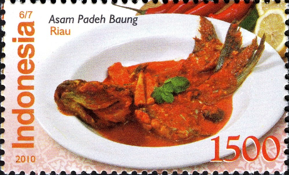 Visibility: public Image owner: none postage 7/6/2010 1500r multi issue=Indonesian Traditional Foods dt=Indonesian traditional foods d=Asam Padeh Baung unwmk Crops No visible images cropped from this one. Measurements Resolution is unknown. Source Source name: Colnect File URL: http://i.colnect.net/b/1565/303/Asam-Padeh-Baung.jpg Uploaded September 10, 2014, 11:15 pm by Stan Shebs |
