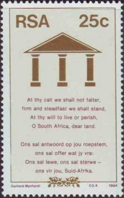 Visibility: public Image owner: none postage 9/3/1984 25c multi issue=New Constitution d=Statements of National anthem wmk=RSA in triangle Crops No visible images cropped from this one. Measurements Resolution is unknown. Source Source name: Colnect File URL: http://i.colnect.net/images/b/763/303/Statements-of-National-anthem.jpg Uploaded September 11, 2014, 6:59 pm by Stan Shebs |