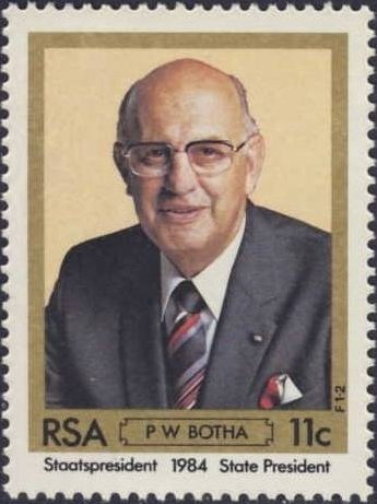 Visibility: public Image owner: none postage 11/2/1984 11c multi issue=Inauguration of President Botha d=President P. W. Botha wmk=RSA in triangle Crops No visible images cropped from this one. Measurements Resolution is unknown. Source Source name: Colnect File URL: http://i.colnect.net/b/810/778/President-P-W-Botha.jpg Uploaded September 11, 2014, 6:59 pm by Stan Shebs |