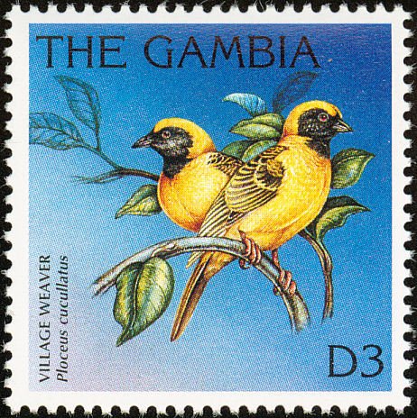 Visibility: public Image owner: none postage 10/22/1996 3d multi issue=Birds 1996 dt=birds (1996 Gambia) d=Ploceus cucullatus (1996) unwmk perf=14 Crops No visible images cropped from this one. Measurements Resolution is unknown. Source Source name: Colnect File URL: http://i.colnect.net/b/1462/531/Village-Weaver Textor-cucullatus.jpg Uploaded September 11, 2014, 7:03 pm by Stan Shebs |
