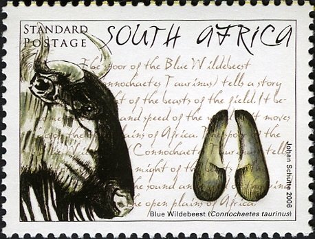 Visibility: public Image owner: none postage 9/15/2006 Standard Postage multi dt=animals & their tracks d=buffalo (2006) unwmk Crops No visible images cropped from this one. Measurements Resolution is unknown. Source Source name: Colnect File URL: http://i.colnect.net/b/1608/378/Blue-Wildebeest-Connochaetes-taurinus.jpg Uploaded September 11, 2014, 8:31 pm by Stan Shebs |