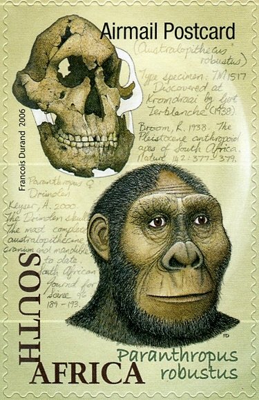 Visibility: public Image owner: none airmail 11/10/2006 Airmail Postcard multi issue=Origin of Humankind dt=human ancestors unwmk Crops No visible images cropped from this one. Measurements Resolution is unknown. Source Source name: Colnect File URL: http://i.colnect.net/b/1608/387/Paranthropus-robustus.jpg Uploaded September 11, 2014, 8:32 pm by Stan Shebs |