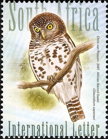 Visibility: public Image owner: none postage 8/3/2007 International Letter multi dt=South African owls d=African Barred Owlet unwmk Crops No visible images cropped from this one. Measurements Resolution is unknown. Source Source name: Colnect File URL: http://i.colnect.net/b/1608/392/African-Barred-Owlet-Glaucidium-capense-.jpg Uploaded September 11, 2014, 8:32 pm by Stan Shebs |